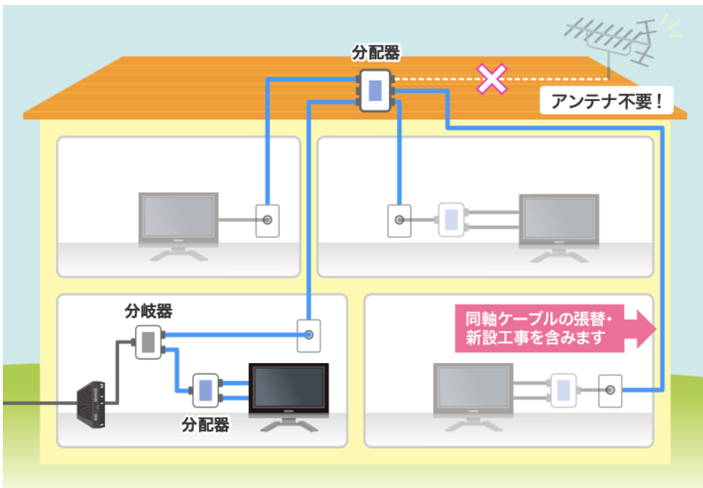 その後は同軸ケーブルでのテレビ工事と同様で、分配器を通し、各部屋のテレビ端子までつなげます。