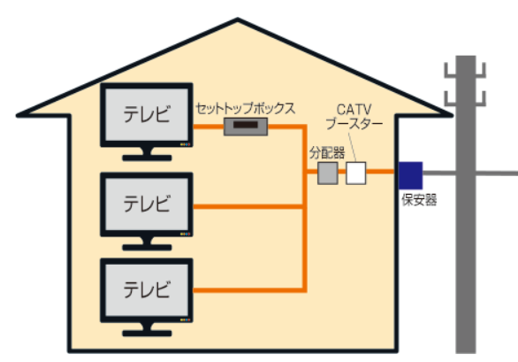 ケーブルテレビ局が地上波放送とBS放送、CS放送を受信し、ケーブル線を通して各家庭にテレビ信号を送信します。
