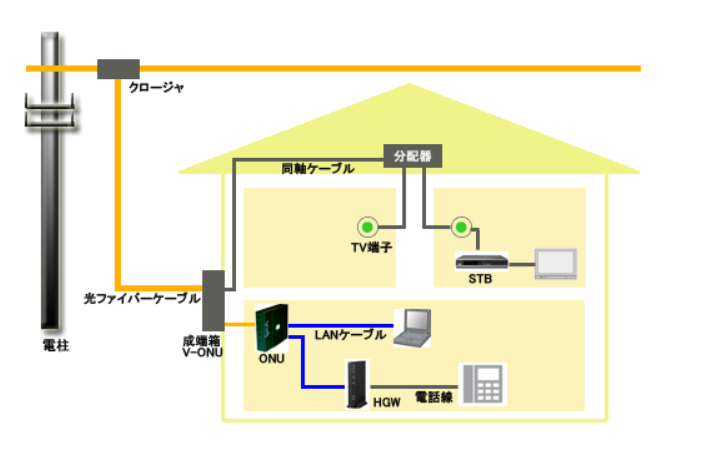 V-ONUからテレビ用の同軸ケーブルと、ネットや電話用の光ファイバーへ分岐します。
